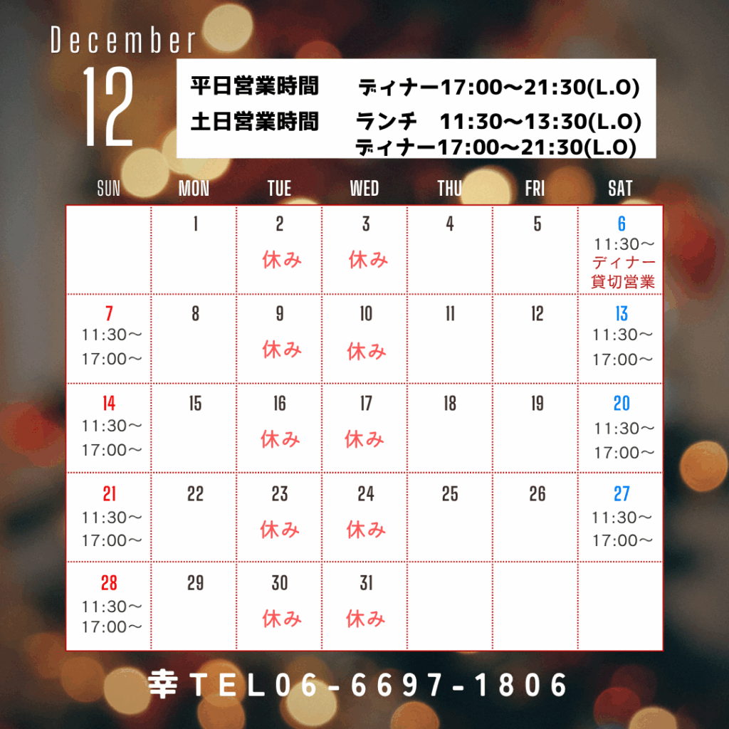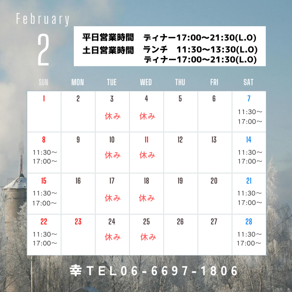 | 営業時間 | 【営業時間】 17:00〜22:00 (L.O)21:30 土日 11:30〜14:00 (L.O)13:30 17:00〜22:00(L.O)21:30 |